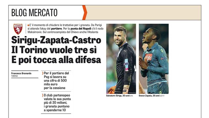 Non solo Niang dunque, profilo che ma su cui ci sono anche le mire dell'Everton: anche l'altro Zapata () fa capolino tra gli interessi del Torino, e i frequenti contatti tra le alte sfere delle due società non possono che favorire questa pista , che potrebbe portare ad un elemento di esperienza (31 anni a settembre), di sostanza e con il vizio del gol (come quello realizzato al '97 nel 2-2 del primo derby della Milano cinese). Un profilo, dunque, che Cairo e Petrachi tengono d'occhio. Il nodo, al momento, rischia di essere rappresentato dall'ingaggio, attorno al milione e mezzo annuo: una cifra decisamente alta per il budget granata, che normalmente offre contratti simili solo ai propri top-player. Un altro tassello su cui lavorare nel mese scarso che porta al primo ritrovo in vista della nuova stagione.