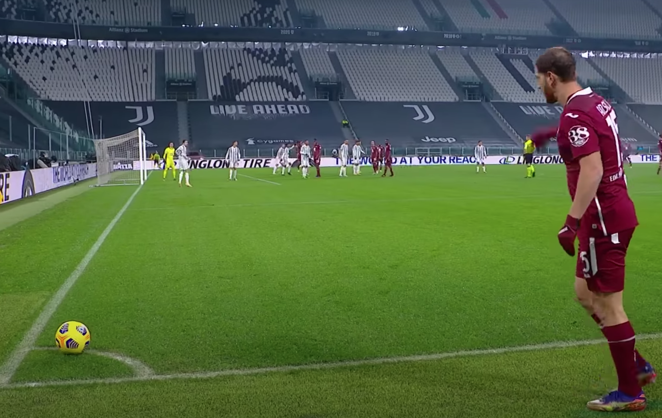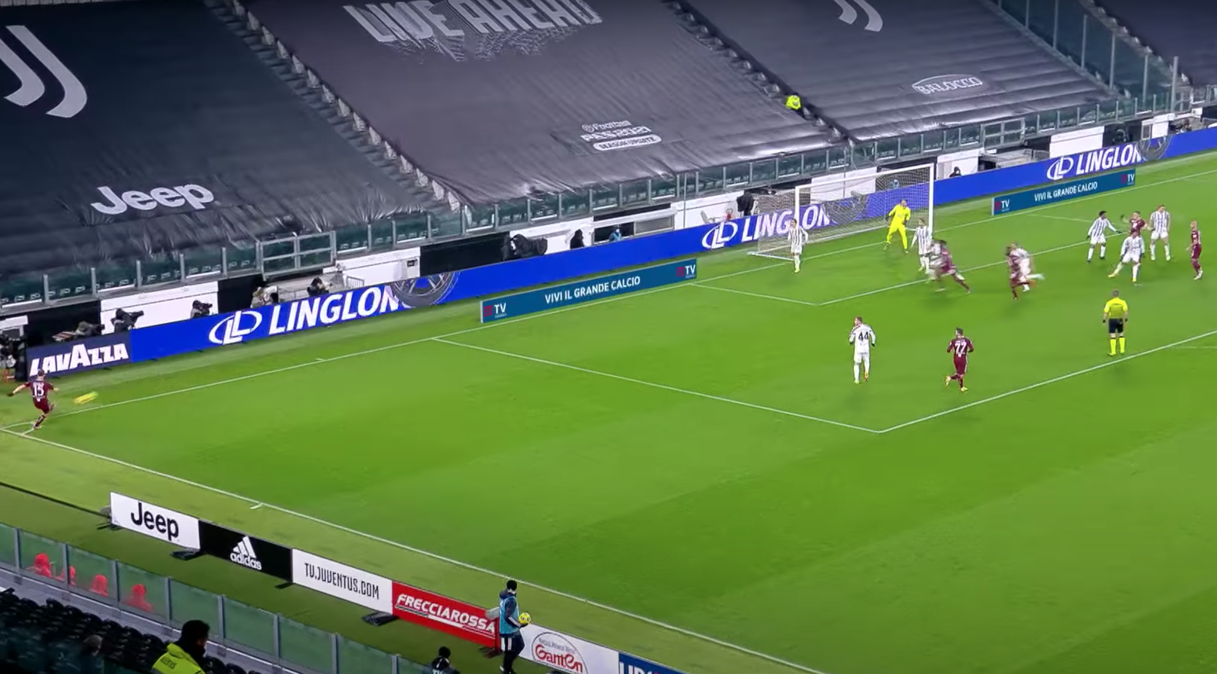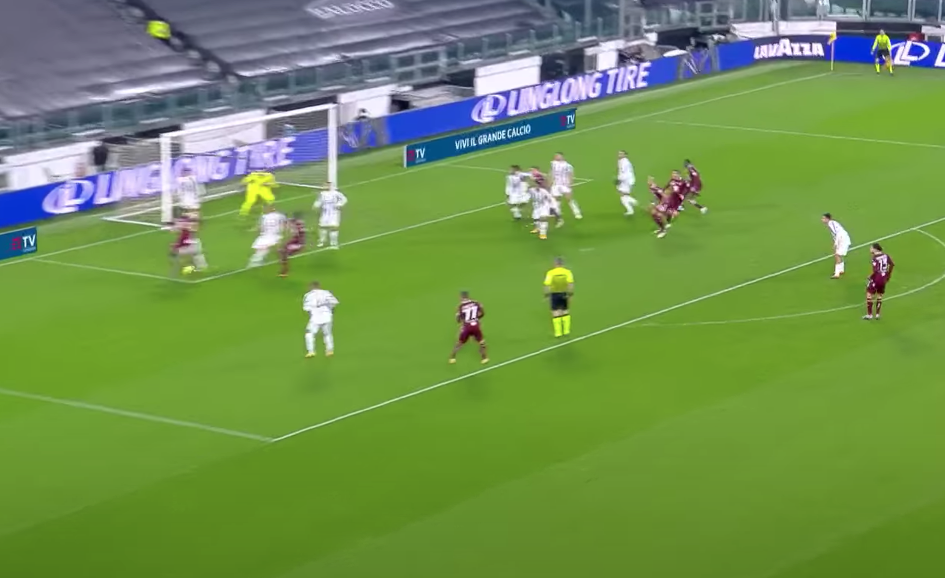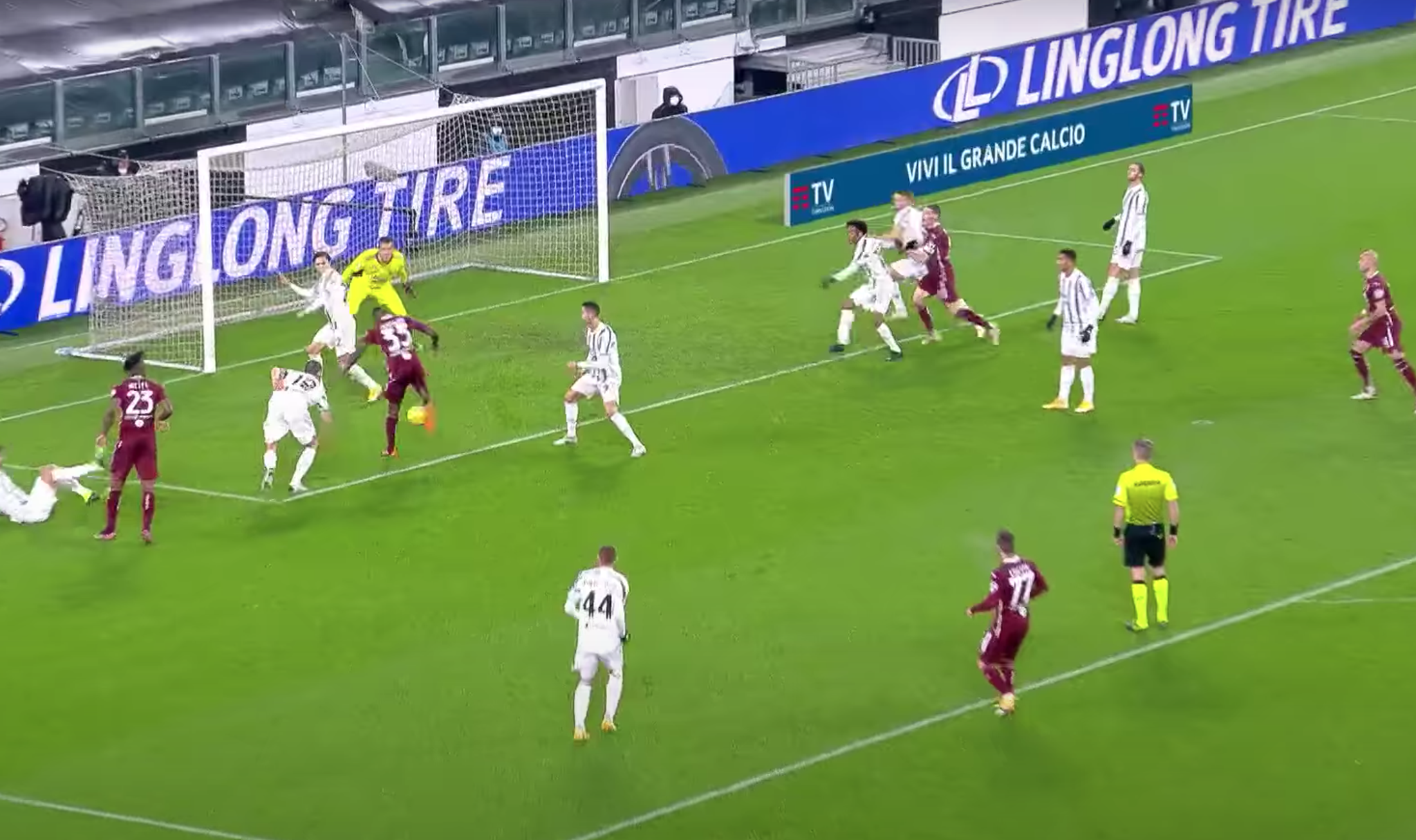 La deviazione del mediano bianconero sorprende Bonucci che era nei pressi e libera Nkoulou. Il difensore granata da solo davanti alla porta calcia d'esterno e non sbaglia. Palla in buca d'angolo e vantaggio Torino.