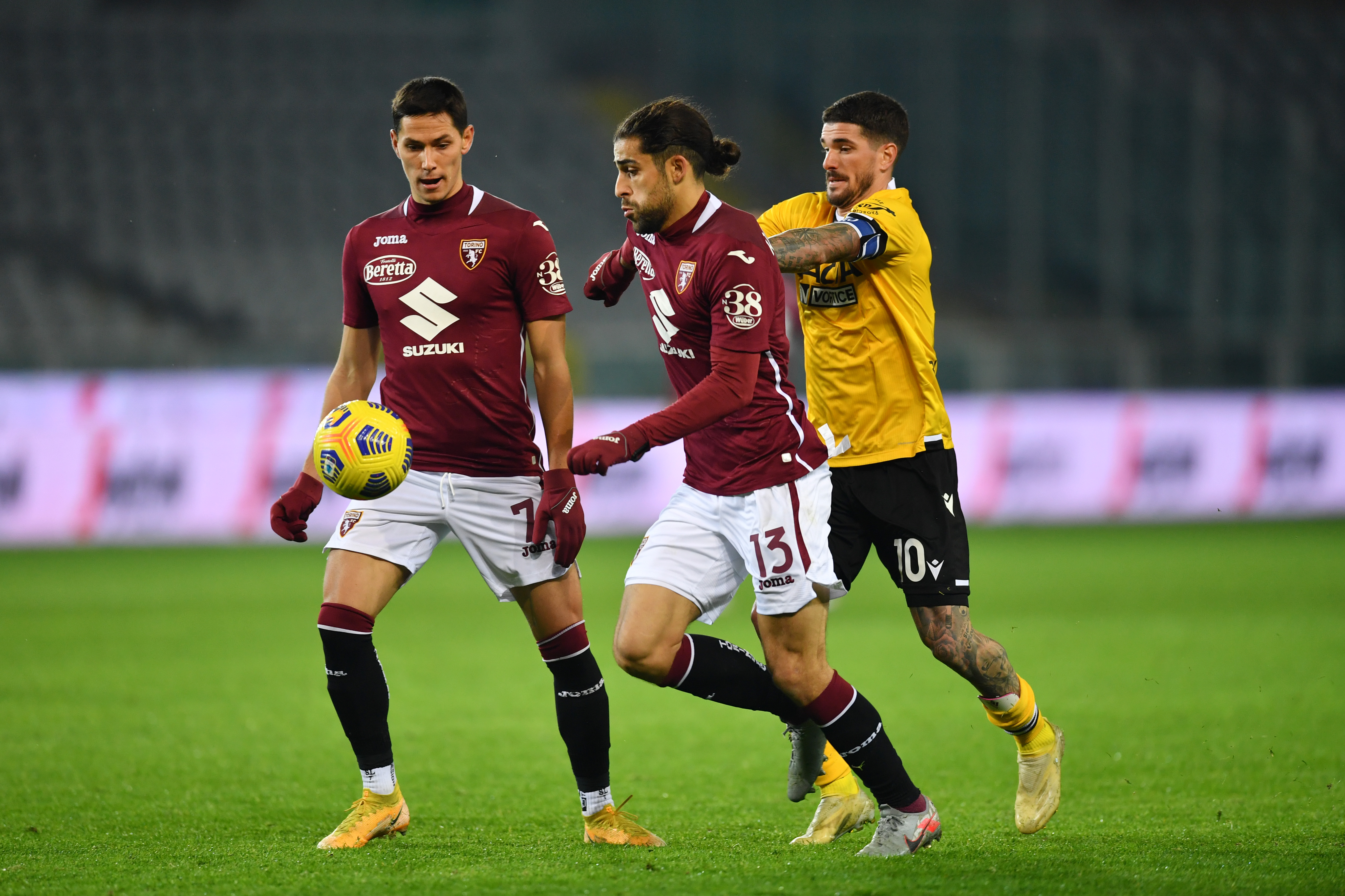 TURIN, ITALY - DECEMBER 12: Sasa Lukic and Ricardo Rodriguez of Torino F.C. battle for possession with Rodrigo De Paul of Udinese Calcio during the Serie A match between Torino FC and Udinese Calcio at Stadio Olimpico di Torino on December 12, 2020 in Turin, Italy. Sporting stadiums around Italy remain under strict restrictions due to the Coronavirus Pandemic as Government social distancing laws prohibit fans inside venues resulting in games being played behind closed doors. (Photo by Valerio Pennicino/Getty Images)