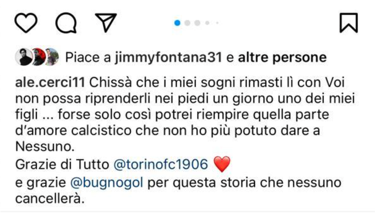 Alessio Cerci ha postato, sul suo profilo Instagram, alcuni screen dell’ultimo articolo scritto da Francesco Bugnone per Toro News (qui per leggere l’ultima puntata della sua rubrica “Culto”), nel quale si ripercorreva il percorso emozionante al Torino dell’attaccante esterno oggi all’Arezzo. Tra i vari momenti non poteva mancare la rete messa a segno contro il Genoa in quel folle 2-1. Un gol che è rimasto impresso nella memoria di tantissimi tifosi e dello stesso Cerci (che si è anche tatuato la data della partita). Il quale dimostra ancora tanto affetto nei confronti dell’universo granata commentando così la rubrica: "Chissà che i miei sogni rimasti lì con Voi non possa riprenderli nei piedi un giorno uno dei miei figli ... forse solo così potrei riempire quella parte d'amore calcistico che non ho più potuto dare a nessuno. Grazie ancora al Torino FC e grazie a Francesco Bugnone per questa storia che nessuno cancellerà".
