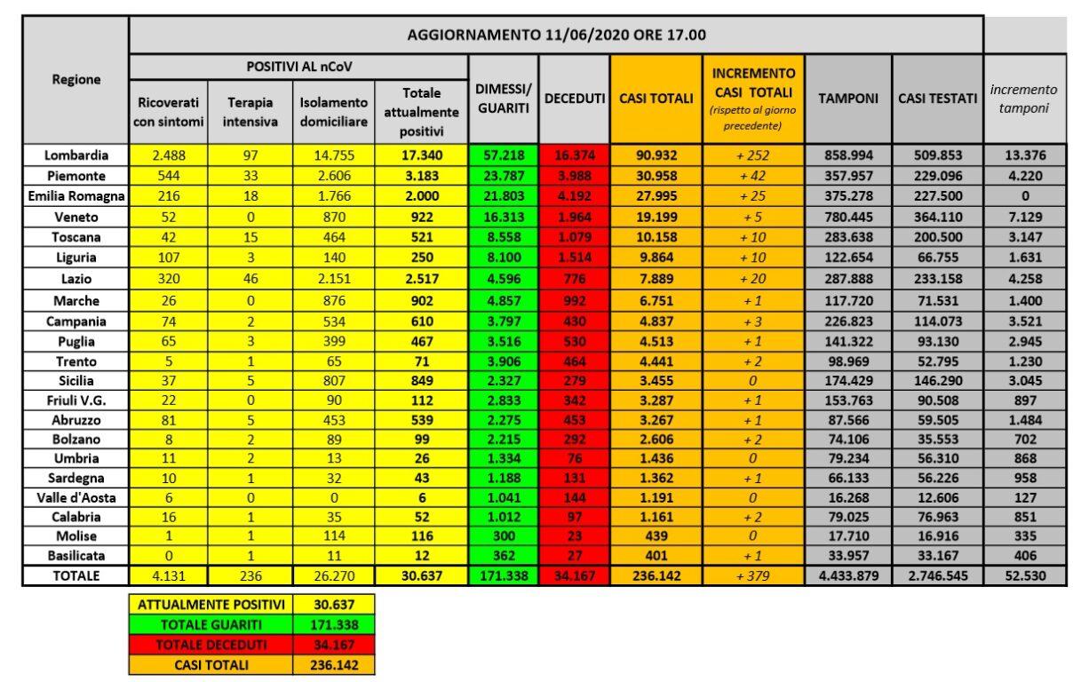 La Protezione Civile ha diramato i dati dell'epidemia coronavirus aggiornati all'11 giugno. Diminuiscono i decessi (ieri 71 e oggi 53) e aumentano sempre considerevolmente i guariti, che oggi sono ben 1399. Ma risalgono i contagi: i nuovi positivi sono 379 (ieri +203) e attualmente in totale sono 30.637 ovvero 1073 in meno rispetto a ieri. Dei nuovi positivi, 252 sono stati rilevati in Lombardia. Oggi il calo di persone ricoverate in terapia intensiva è di 13 unità (236 in tutta Italia).