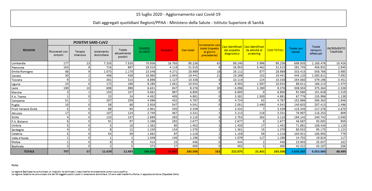 Come di consueto è stato diramato il bollettino della Protezione Civile. 13 morti nelle ultime 24 ore nella penisola italiana, mentre i nuovi positivi sono stati 162, ovvero 7 in meno rispetto a martedì 14 luglio. I guariti nelle ultime 24 ore sono stati 575. I nuovi positivi in Piemonte sono 8 contro i 63 della Lombardia.