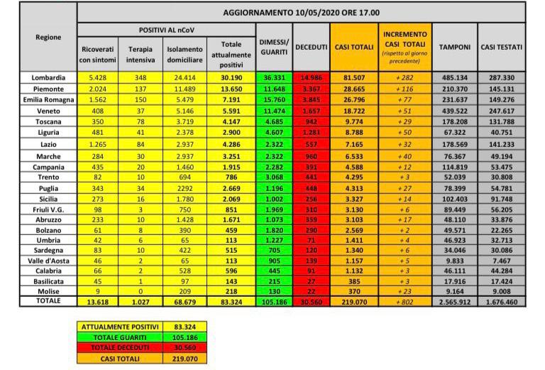 Diramato il bollettino giornaliero della Protezione Civile con i numeri dell'epidemia in Italia. Oggi si sono registrati 802 malati in 24 ore e 165 nuove vittime, in diminuzione rispetto a ieri. Ad oggi, il totale delle vittime in Italia supera quota 30mila (30.560). Complessivamente sono 219.070, i casi totali di persone colpite dal Covid-19 dall’inizio del monitoraggio dell’epidemia, con un incremento di +802 in un giorno.