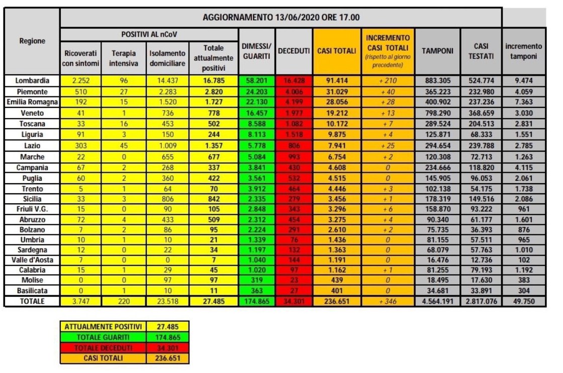 I numeri della pandemia diramati dalla Protezione Civile ci dicono che nella giornata odierna sono stati 346 i nuovi positivi. In totale dall'inizio dell'emergenza sono stati 236.651 i contagiati. I morti nelle ultime 24 ore sono stati 78, ma questo dato merita di essere contestualizzato, perché 23 decessi derivano da un ricalcolo della regione Lazio. I deceduti totali si avvicinano, quindi, alle 35mila unità (34.305 per la precisione). I guariti delle ultime 24 ore sono stati ben 1.780 e così il totale degli attualmente positivi si attesta a quota 27.485 unità.