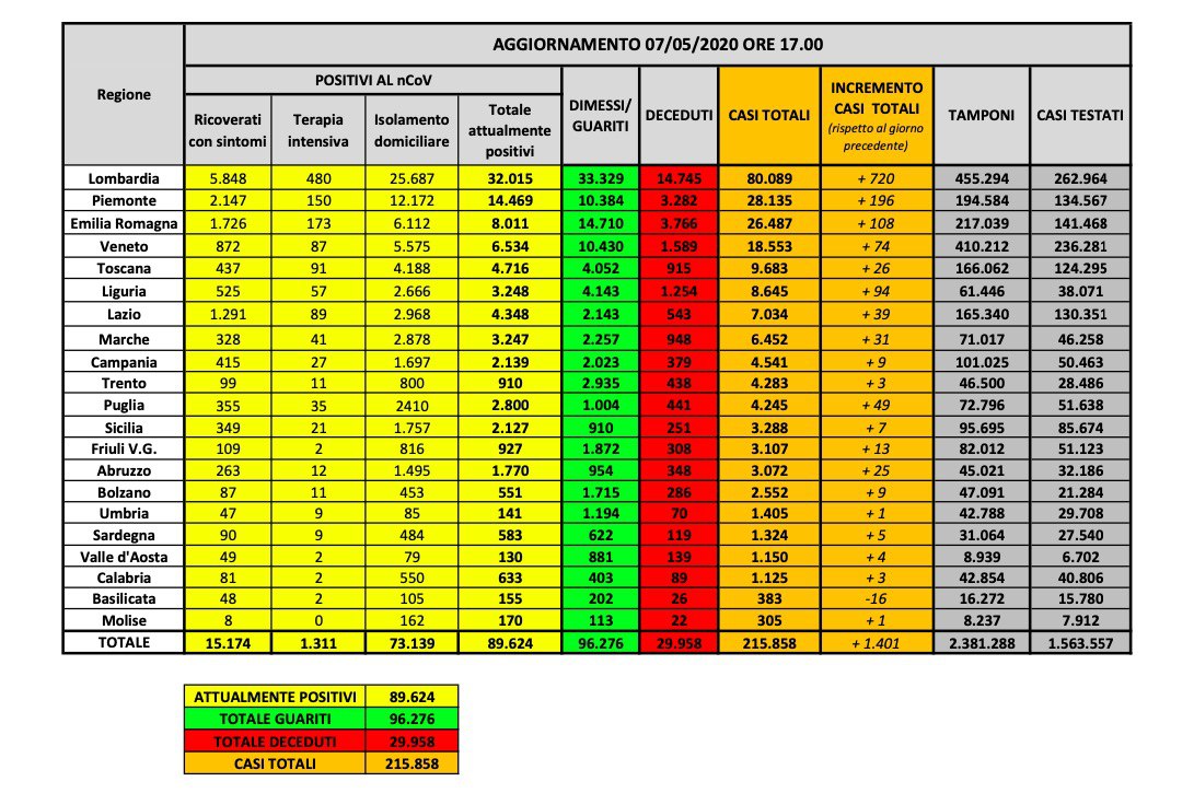 La situazione / -3.119 malati nelle ultime 24 ore. 194 morti e così si tocca quota 30.201 da inizio epidemia
