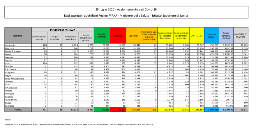 Sono 275 i nuovi contagiati da Covid-19 nelle ultime 24 ore in Italia, in leggero aumento rispetto ai 252 di ieri. Le vittime sono invece 5, dato costante rispetto a ieri che si registrava sempre un aumento di 5 morti. I guariti sono 128, in questo caso si verifica una diminuzione rispetto a ieri che erano 350 i guariti. I pazienti ricoverati con sintomi sono 731 (+18), di cui 41 in terapia intensiva (ieri erano 46). In Piemonte si registra un aumento di Piemonte di 16 casa, ieri erano aumentati di 11.
