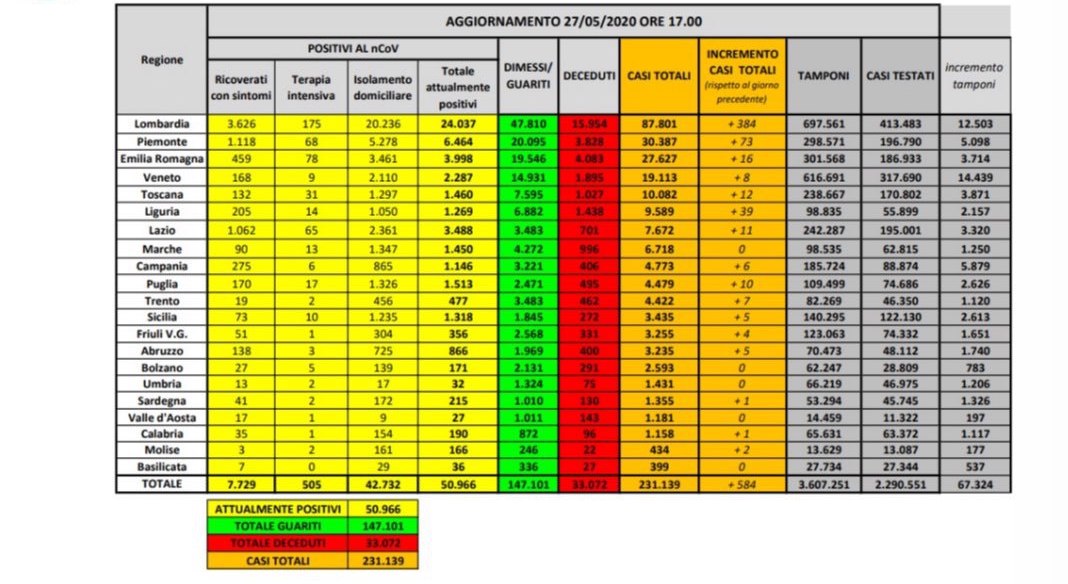 Continua ad essere positivo il trend per quanto riguarda la diffusione del Covd-19 sul territorio italiano. I dati comunicati nel bollettino della Protezione Civile segnalano infatti come il numero degli attualmente positivi sia sceso a 50.966, facendo registrare una diminuzione di 1.976 unità rispetto a ieri. I nuovi casi rilevati nelle ultime 24 ore sono stati invece 584. Leggermente in aumento, rispetto a ieri, il numero dei deceduti: 117 in più, per un totale di 33.072. In crescita anche i guariti: il totale è salito a 147.101 grazie ai 2.443 registrati oggi. Positivo il dato riguardante le terapie intensive: 16 ricoverati in meno di ieri, il totale è di 505. Per quanto riguarda invece il Piemonte, l'incremento dei casi è stato di 73 unità rispetto a ieri. Ma la notizia migliore riguarda i decessi: per la prima volta non ne è stato registrato nemmeno uno.
