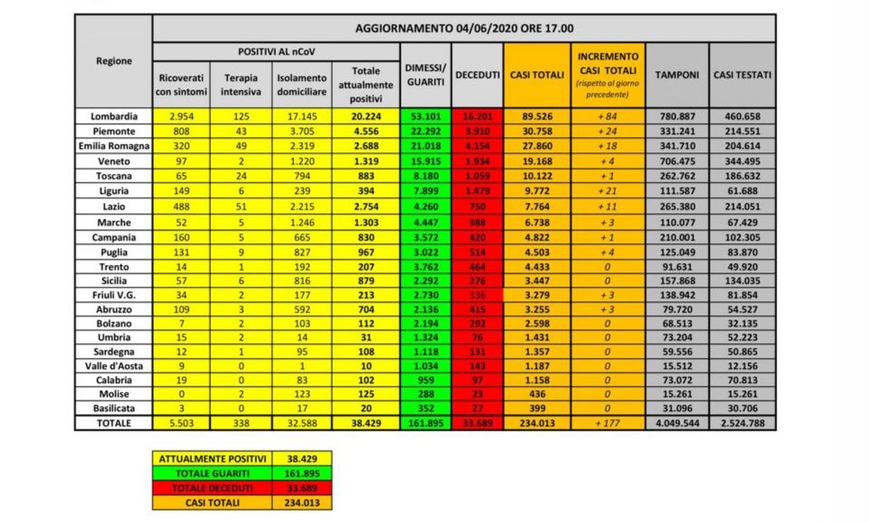 Continua a calare il numero delle persone attualmente positive al coronavirus. Secondo i dati della Protezione Civile, attualmente in Italia sarebbero in tutto 38.429 i soggetti con il Covid-19. I casi nuovi rispetto a ieri sarebbero infatti 177, a fronte di 957 guariti e 88 deceduti. al primo marzo, quando hanno iniziato a crescere in maniera esponenziale, non era mai stato così basso l'incremento giornaliero. E non è solo per il numero di tamponi fatti: è al minimo anche il rapporto tra nuovi casi e test effettuati e tra nuovi casi e persone sottoposte a tampone.