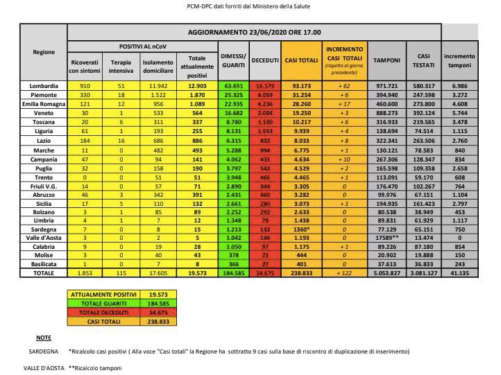La Protezione civile ha reso noti i dati relativi alle ultime 24 ore. Il dato più significativo arriva dal numero di persone ricoverate in terapia intensiva, che oggi è calato del 9,4% (12 in meno e il totale ora è di 115 in tutta Italia). Continua a diminuire il trend legato alle persone attualmente positive, oggi 1064 in meno rispetto a ieri. Dato reso possibile anche grazie ai 1159 guariti. Nelle ultime 24 ore sono stati trovati 122 nuovi contagiati su 40.485 tamponi effettuati su tutto il Paese. I deceduti sono 18, mai così pochi da quando è iniziata l'emergenza.