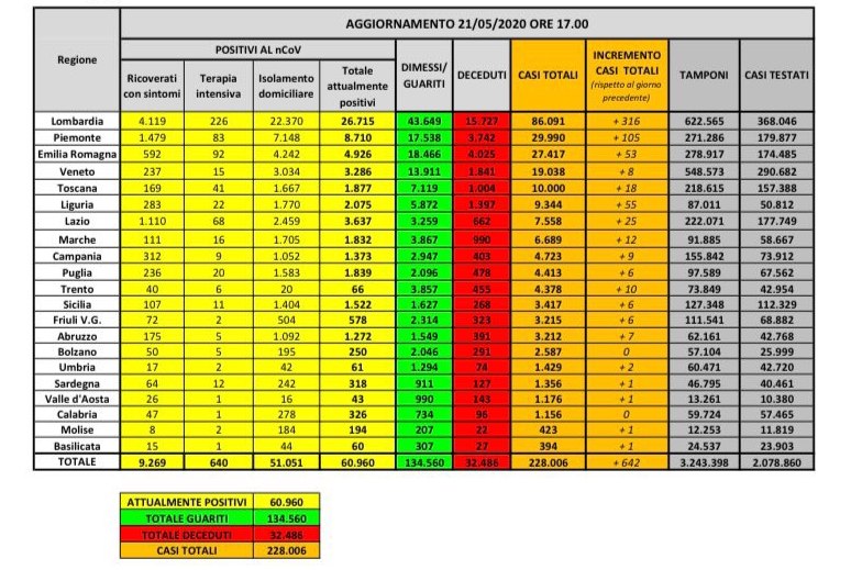 Continuano ad essere positivi i numeri relativi alla diffusione del coronavirus in Italia. Il bollettino odierno della Protezione Civile ha infatti evidenziato come i nuovi positivi siano solamente 642 in più di ieri. Per quanto riguarda invece il numero dei soggetti attualmente positivo, il numero complessivo è di 60.960 (1.792 in meno di ieri). I guariti nelle ultime ventiquattro ore sono stati infatti 2.278, che hanno portato il totale a 134.560. Per quanto riguarda invece i deceduti, l'incremento giornaliero è di 156 unità, per un totale di 32.486 vittime.