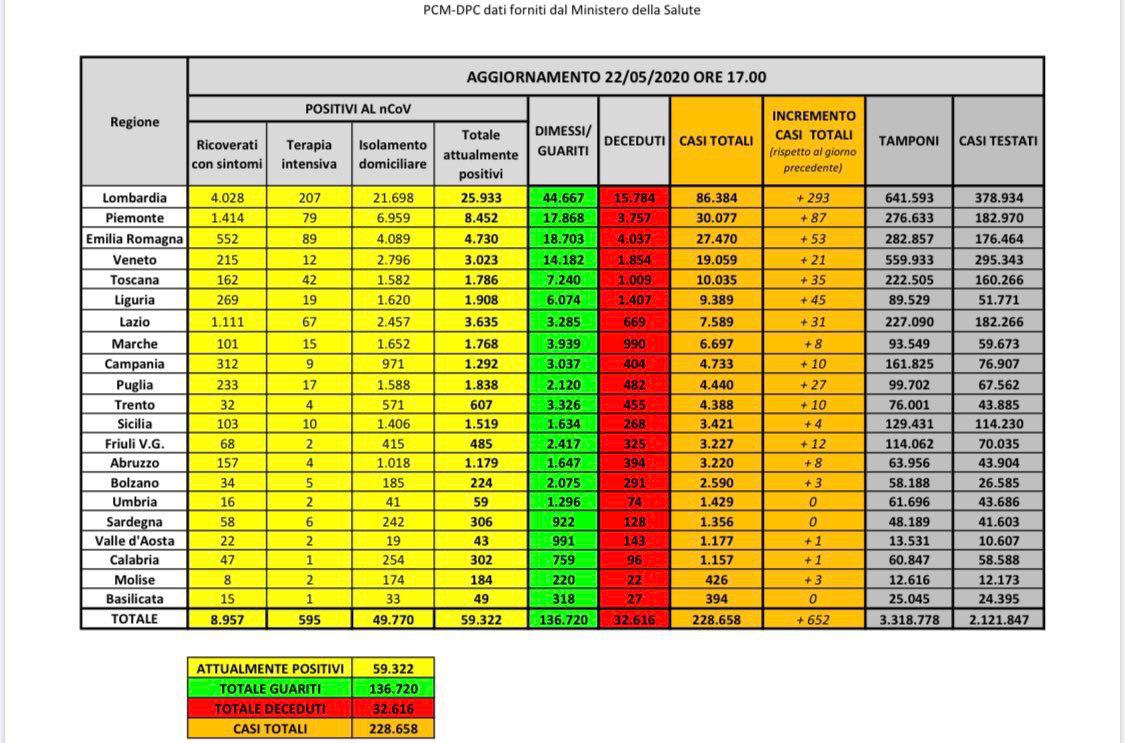 Continuano ad essere positivi i numeri relativi alla diffusione del Coronavirus in Italia. Il bollettino odierno della Protezione Civile ha infatti evidenziato come i nuovi positivi siano solamente 652 nelle ultime 24 ore (erano 642 nelle 24 ore precedenti). Il numero di decessi odierno si attesta a quota 130 per un totale di 32.616. I guariti, invece, hanno superato quota 135mila. Con gli oltre 2mila odierni (2.160) siamo a 136.720. Gli attualmente positivi in Italia si attestano al di sotto delle 60mila unità ed è questo un dato molto importante che testimonia la notevole discesa delle ultime settimane.