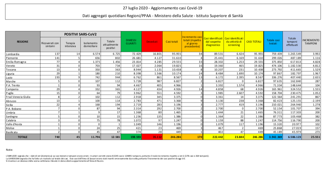 Sono 170 i nuovi contagiati da Covid-19 nelle ultime 24 ore in Italia, in diminuzione rispetto ai 255 di ieri. Pesa però, come ogni lunedì, l'"effetto weekend", con un drastico calo dei tamponi (oggi 25.551, la metà della media di oltre 50mila). Le vittime sono invece 5, dato costante rispetto a ieri che si registrava sempre un aumento di 5 morti. I guariti sono 147, si verifica un aumento rispetto a ieri che erano 126 i guariti. Prosegue il trend di lieve aumento dei ricoveri registrato negli ultimi giorni: quelli in regime ordinario sono 5 in più (740 in tutto), mentre le terapie intensive salgono di una unità, da 44 a 45. In Piemonte si registra un aumento di Piemonte di 4 casi, ieri erano aumentati di 12.