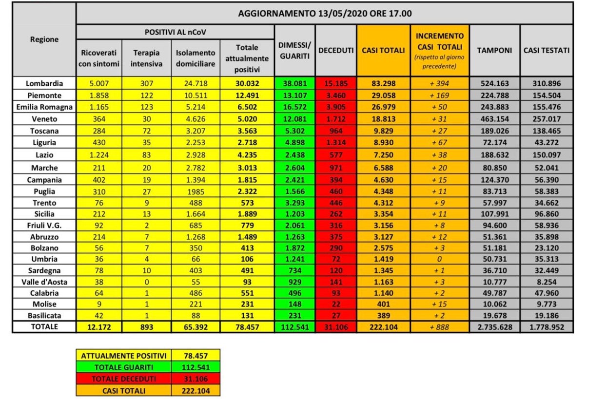 Continuano ad essere positivi i dati comunicati dalla Protezione Civile nell'ormai consueto bollettino delle 18. Il numero di casi attualmente positivi al Covid-19 è infatti in diminuzione: ad oggi il totale è di 78.457, rispetto a ieri sono 2.809 in meno. Positivo anche il dato riguardante i guariti: nelle ultime ore sono stati 3.502 in più, con il numero complessivo che è così salito a 112.541. A rimanere stabile è invece il numero dei deceduti: 31.106 in tutto, 195 in più di ieri. I nuovi positivi sono stati invece 888.