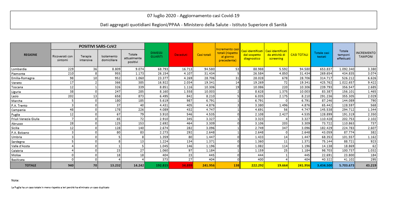 Scendono i contagi sotto quota 150, risalgono i decessi e si attestano sui 30 nelle ultime 24. Questi i dati inerenti la giornata odierna, martedì 7 luglio, in Italia circa la pandemia da Coronavirus. I nuovi positivi sono stati 138, mentre i guariti sono stati 574. In Piemonte i nuovi contagiati sono stati soltanto 5 nelle ultime 24 ore, mentre i numeri restano abbastanza alti in Lombardia (53). Anche in Emilia-Romagna la situazione dev'essere monitorata con attenzione: +31 nelle ultime 24 ore alla casella nuovi contagiati.