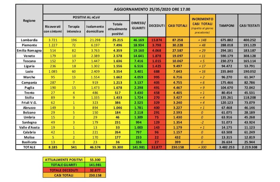 Continuano ad essere positivi i dati comunicati dalla Protezione Civile nell’ormai consueto bollettino giornaliero sul monitoraggio della situazione Coronavirus in Italia. Soltanto 300 nuovi positivi nelle ultime 24 ore e i decessi sono 92. Gli attualmente positivi nel nostro paese sono poco più di 55mila. I deceduti totali dall'inizio dell'emergenza, invece, sono 32.877. Si registrano nella giornata odierna ben 1.502 guariti. Confermati, inoltre, gli zero decessi di ieri in Lombardia per Coronavirus. Oggi, invece, sono stati 34 con 148 nuovi positivi. Erano dati molto attesi quelli della regione più colpita dall'emergenza considerato che ieri gli zero decessi erano stati accolti come un segnale realmente importante in questa fase-2. In Piemonte nella giornata odierna 48 nuovi positivi.