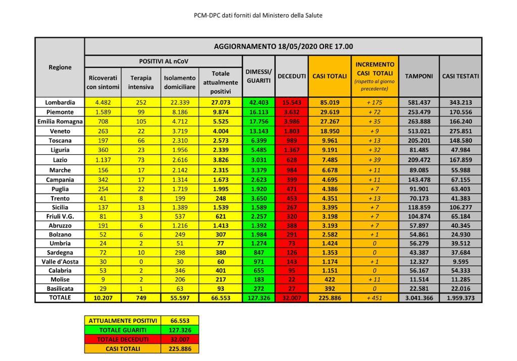 Il 18 maggio sarà ricordato non soltanto per la riapertura di quasi tutte le attività produttive d'Italia, ma anche per dei numeri notevolmente positivi inerenti la pandemia. Soltanto 99 nuovi decessi nelle ultime 24 ore. In totale i deceduti sono saliti a quota 32mila. I nuovi positivi sono stati soltanto 451 nelle ultime 24 ore. In totale i positivi dall'inizio dell'emergenza sanitaria sono 225.886, di cui solamente 66.553 attuali (ben 1.798 in meno nell'ultima giornata). I guariti sono 127.326. Anche in questo caso incremento molto positivo nelle ultime 24 ore: +2.366. I casi in terapia intensiva sono diminuiti di ulteriori 13 unità e ora si attestano sui 749 pazienti. I tamponi effettuati in questo lunedì hanno superato quota 36mila.