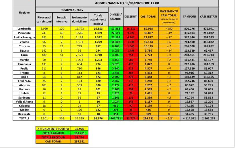 • POSITIVI: 234.531 (+518) di cui 36.976 attuali (-1.453) • DECEDUTI: 33.774 (+85) • GUARITI: 163.781 (+1.886)