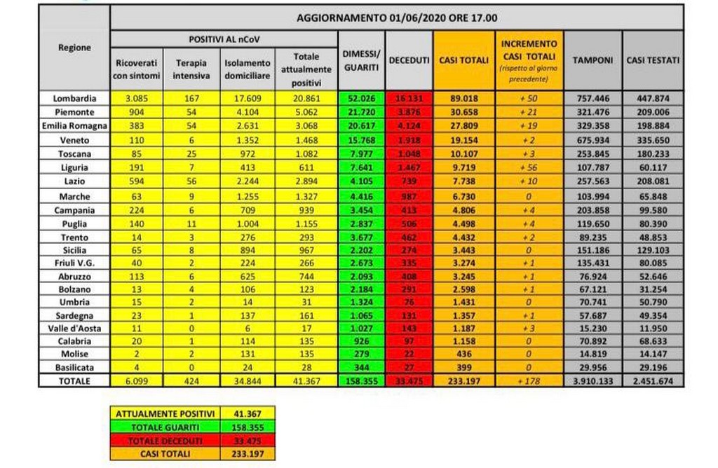 Continua il trend di discesa dei dati sul coronavirus in Italia. Anche in questo lunedì 1 giugno, pur tenendo conto del consueto calo di tamponi effettuati la domenica (in aumento di 31.394 rispetto a ieri), i numeri diramati dalla Protezione Civile sono incoraggianti. Sono infatti solo 178 i nuovi contagi (variazione più bassa fatta registrare dal 26 febbraio); il numero di casi totali sale quindi a 233.197. I decessi nelle ultime 24 ore legati al coronavirus in Italia sono 60. C'è un calo di 708 malati per quanto riguarda gli attualmente positivi, che oggi sono 41.367; i guariti nelle ultime 24 ore sono infatti 848 per un totale di 158.355. Ancora un calo per quanto riguarda il numero delle persone ricoverate in terapia intensiva, sono 424 (11 in meno di ieri).