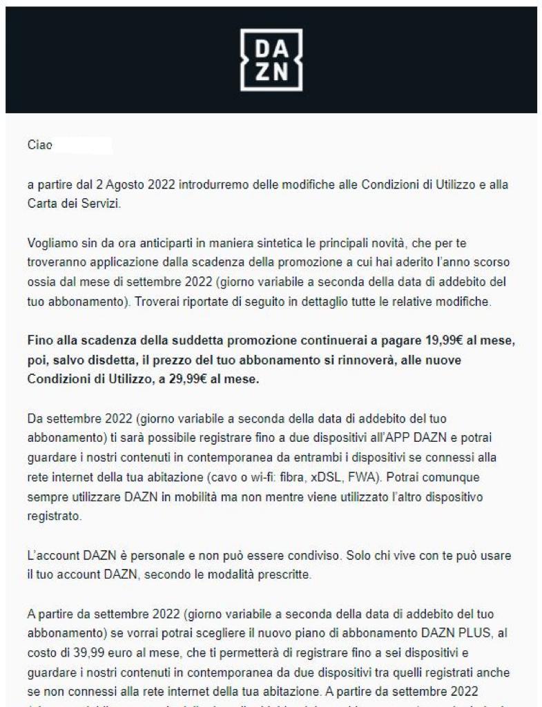 A partire dal 2 agosto 2022 verranno introdotte delle modifiche alle condizioni di utilizzo di DAZN. La novità principale riguarda la tariffa dell'abbonamento mensile, che passa da 19,99 € a 29,99 € al mese. Inoltre a partire da settembre 2022 sarà possibile registrare fino a un massimo di due dispostivi sull'app DAZN, e si potranno visionare i contenuti in contemporanea solo a condizione che entrambi i dispositivi siano connessi alla rete internet della stessa abitazione. In alternativa sarà possibile scegliere un nuovo piano di abbonamento, il DAZN PLUS, che permetterà di registrare fino a sei dispositivi e guardare i contenuti in contemporanea da due dispositivi anche se non connessi alla stessa rete, il tutto a 39,99 € al mese.