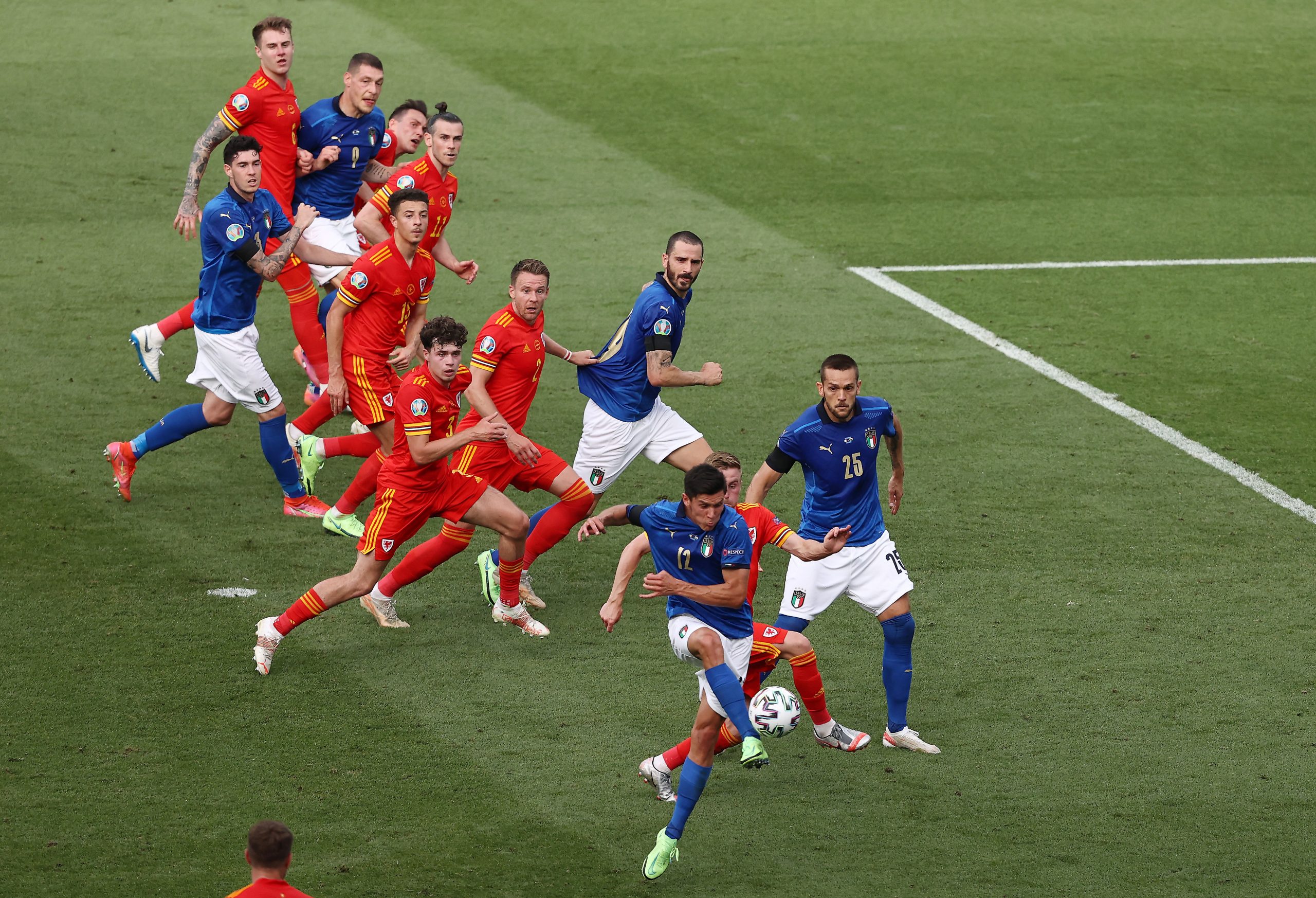 LA PARTITA - L'Italia parte subito forte nel primo tempo e prova a creare alcune occasioni per portarsi in vantaggio fin dai primi minuti. Tra le varie occasioni azzurre al 24' ne capita una sui piedi di Belotti che da posizione defilata non è riuscito a centrare lo specchio della porta. Sembra un primo tempo destinato a chiudersi sullo 0-0 quando al 39' Verratti batte una punizione e mette in mezzo un bel pallone che Pessina devia in rete dopo un ottimo inserimento e mandando la palla a fil di palo. Nella ripresa poi l'Italia cerca di trovare il gol del raddoppio senza riuscirci ma comunque disputa una grande prova dato che non ha concesso praticamente nulla al Galles. Al 60' viene espulso il difensore gallese Ampadu che cercando di recuperare il pallone colpisce Bernardeschi sulla caviglia con il piede a martello.