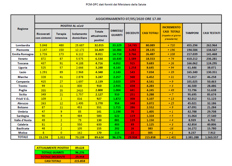 • POSITIVI: 215.858 (+1.401) di cui 89.624 attuali (-1.904) • DECEDUTI: 29.958 (+274) • GUARITI: 96.276 (+3.031)