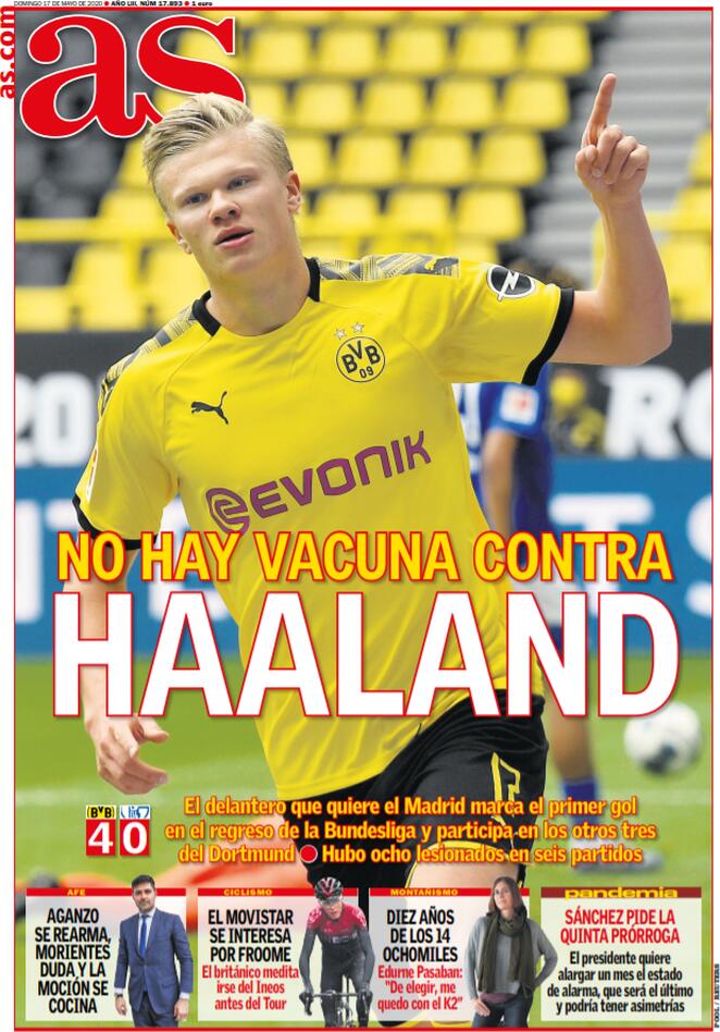 Occhi puntati su Haaland, che alla gara di ripresa segna un goal e partecipa agli altri 3 segnati dai suoi compagni. Su di lui c'è l'interesse del Real Madrid. Per il giornale spagnolo, "non c'è vaccino" contro di lui.