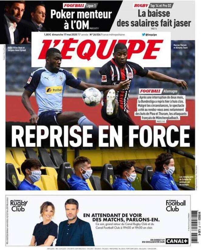 Dopo l'interruzione di 2 mesi, riprende la Bundes. Il tema principale per il quotidiano francese è proprio la ripresa.
