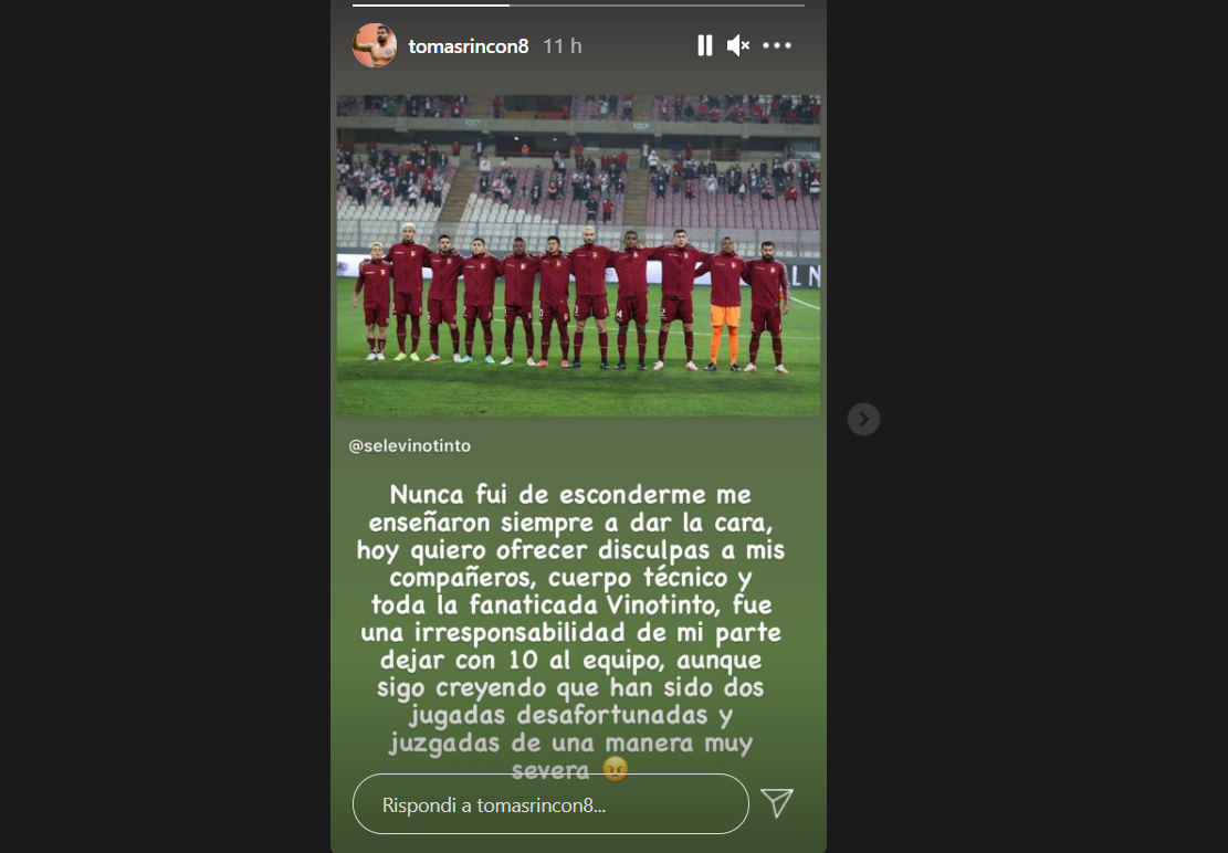 Tomas Rincon chiede scusa al suo Venezuela attraverso una storia su Instagram. Il centrocampista del Torino ha lasciato in 10 la sua selezione nella partita della scorsa notte contro il Perù, persa 1 a 0. Rincon ha preso due gialli nel primo tempo. A tal proposito ha scritto: "Non mi sono mai nascosto, mi hanno sempre insegnato a metterci la faccia. Oggi voglio scusarmi con i miei compagni, lo staff tecnico e tutti i tifosi del Vinotinto, è stato irresponsabile da parte mia lasciare la squadra in 10, anche se credo ancora che ci sono state due giocate sfortunate e giudicate molto severamente".