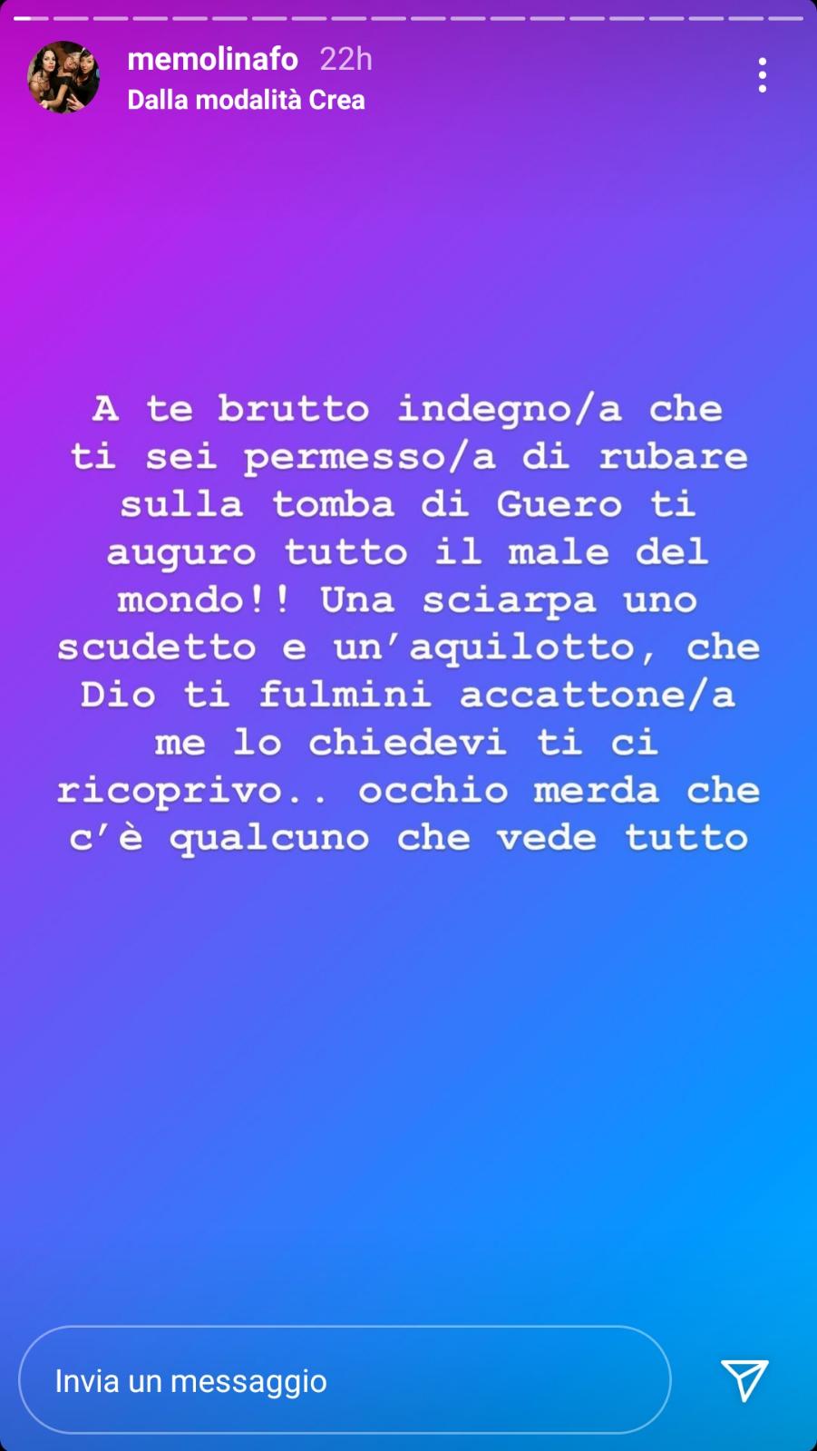 Un gesto vergognoso ha sconvolto la madre di Daniel Guerini e disgustato Ciro Immobile. La tomba del giovane calciatore della Primavera della Lazio (ed ex granata) è stata saccheggiata di tutti i ricordi che amici e parenti avevano lasciato: maglie, scarpe, sciarpe, foto e lettere. La notizia ha indubbiamente sconvolto la madre dell'ex fantasista del Torino venuto a mancare dopo un incidente stradale lo scorso marzo. Queste le parole piene di rabbia della madre condivise attraverso una storia su Instagram: "A te brutto indegno/a, che ti sei permesso/a di rubare sulla tomba di Guero ti auguro tutto il male del mondo. Una sciarpa, uno scudetto, e un aquilotto… Se me lo chiedevi ti ci ricoprivo. Occhio che c’è qualcuno che vede tutto".