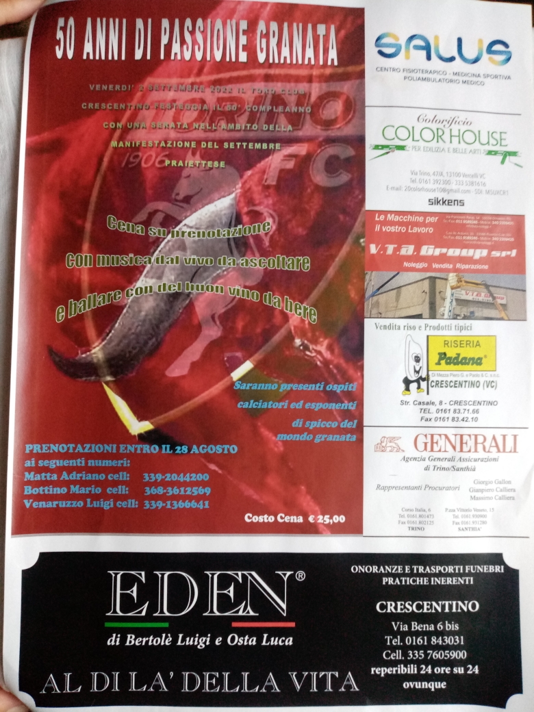 Venerdì 2 settembre, in occasione del suo cinquantesimo anniversario, il Toro Club di Crescentino ha organizzato una serata a tema granata. Cena e musica dal vivo saranno gli ingredienti della festa per celebrare 50 anni di storia del club, e alla serata prenderanno parte anche ospiti, calciatori ed esponenti di spicco del mondo granata. L'ingresso sarà libero per tutti previa prenotazione.