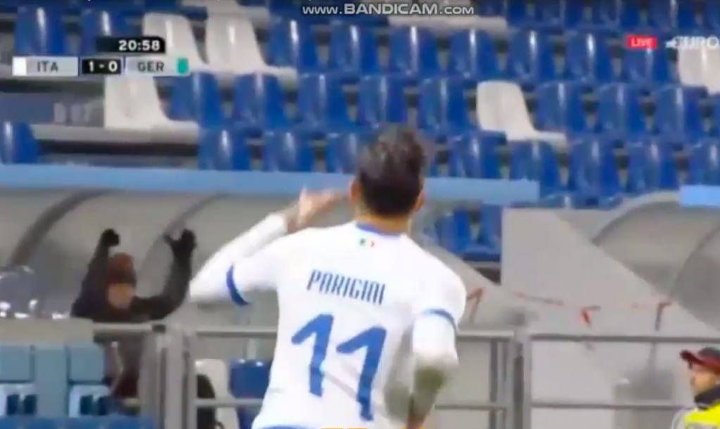 Al 21' l'Italia passa in vantaggio ed è Parigini a metterci il segno. Zaniolo parte fronte alla porta, Parigini gli taglia davanti e viene servito, poi diagonale alle spalle di Nubel.