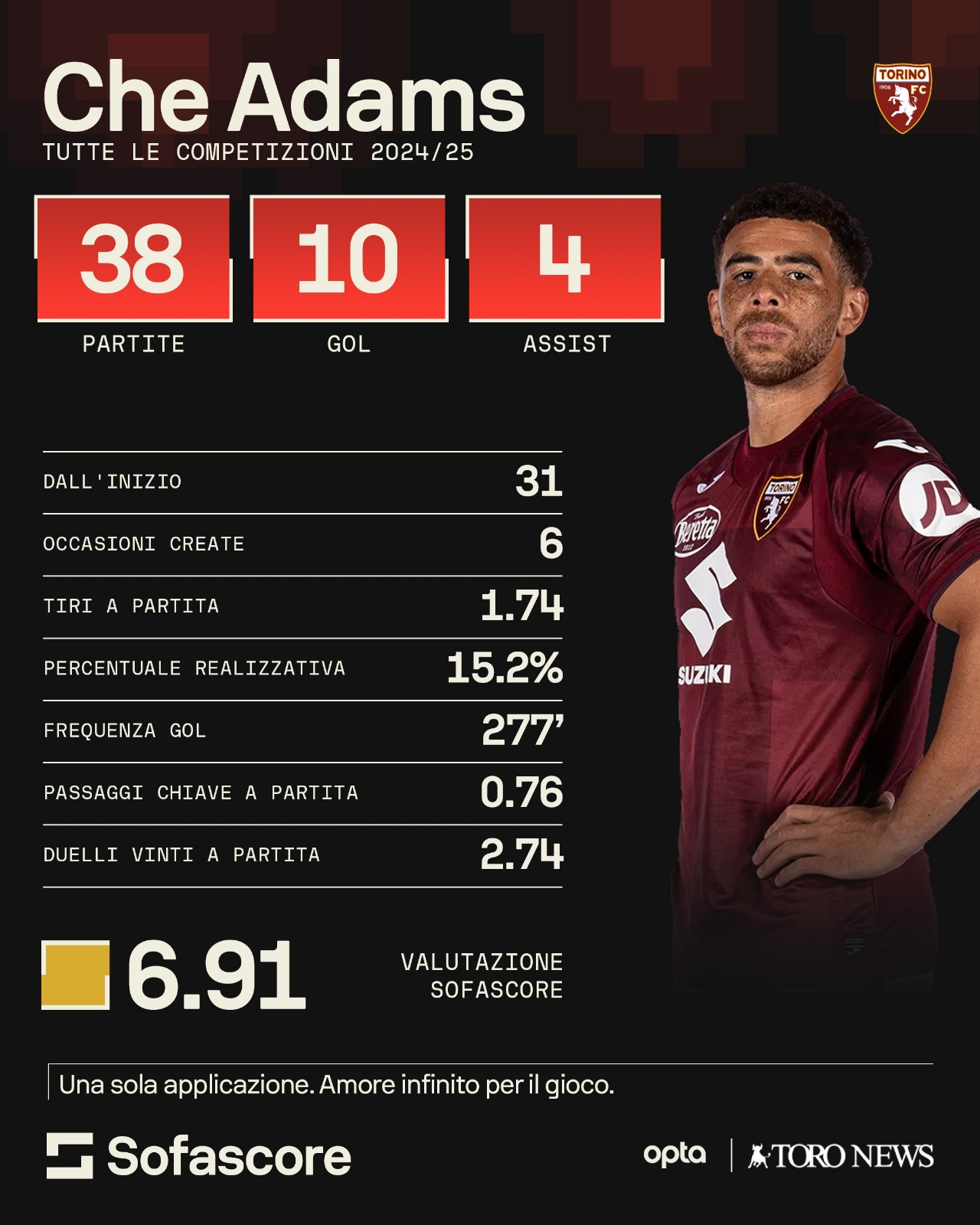 Il nome di Che Adams è tornato a circolare con insistenza oltre Manica. Negli ultimi giorni, infatti, alcuni club inglesi hanno sondato la disponibilità dell’attaccante scozzese, arrivato in granata la scorsa estate. L’interesse è motivato dal suo rendimento nella scorsa stagione: 10 gol e 4 assist in 38 partite con una percentuale realizzativa del 15,2% e una media di 1,74 di tiri a partita, come si può leggere dai dati di Sofascore.