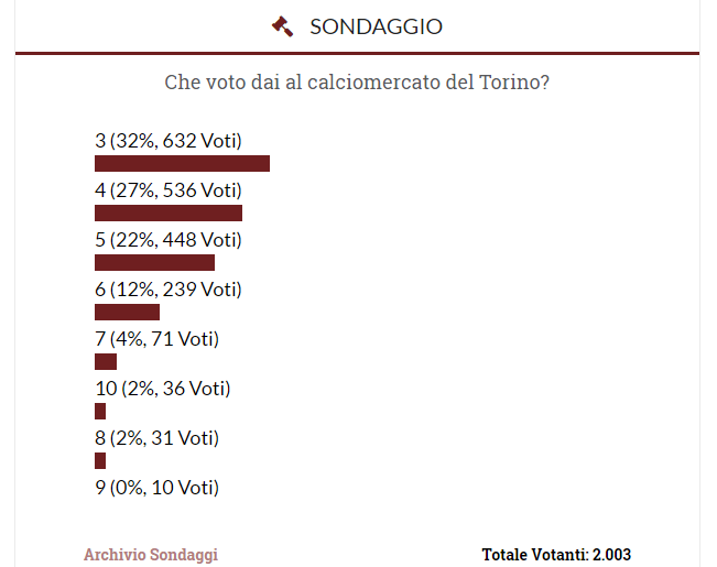 Nella giornata di ieri sulle colonne di Toro News è stato aperto un sondaggio dal nome: "Che voto dai al calciomercato del Torino?" per sapere cosa ne pensano i tifosi granata del mercato portato avanti dalla società granata.