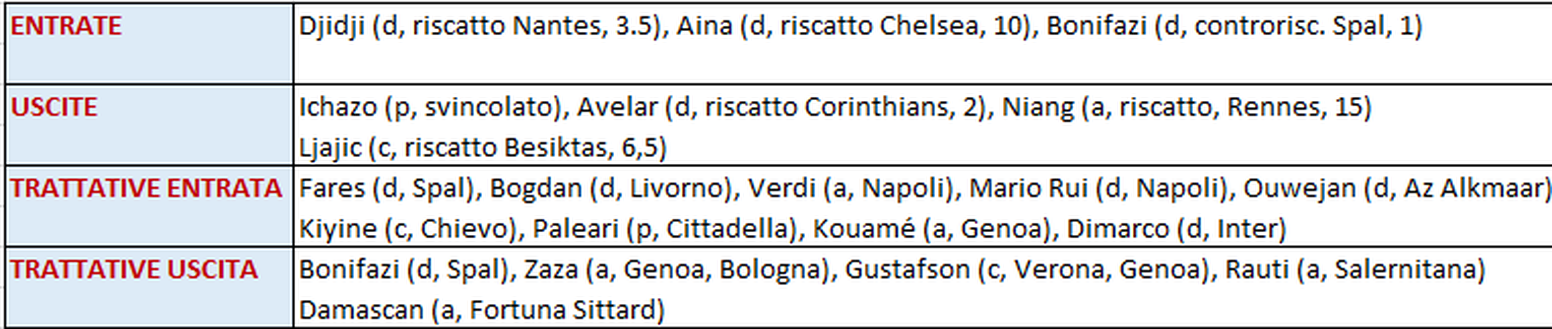 Il tabellone rimane praticamente invariato, con i riscatti di Djidji, Aina e Bonifazi come unici acquisti. Damascan si trasferisce in Olanda al Fortuna Sittard. Trasferimento in Serie C, rispettivamente a Robur Siena e Imolese, per gli ex Primavera Oukhadda e D'Alena. In entrata si raffredda la pista Kouamé: più probabile la permanenza di Zaza.