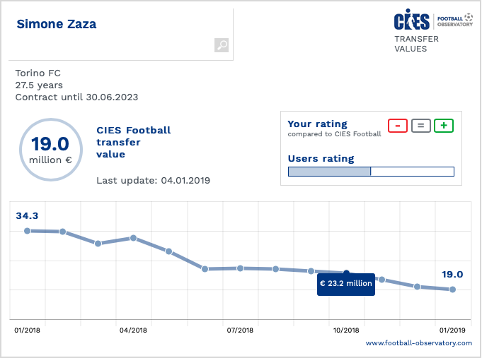 È un indicatore interessante soprattutto per dare valutazioni sul mercato estivo e infatti uno dei giocatori con il distacco più rilevante rispetto a luglio è Simone Zaza. Il Torino ha un obbligo di riscatto fissato a 14 milioni di euro e quando lo ha acquistato, Zaza valeva 24,1 milioni di euro. Guardando al divario tra valore e prezzo d'acquisto, l'attaccante lucano era stato il nono miglior acquisto del mercato. Questa soglia si è ristretta e Zaza ora vale 19 milioni secondo il CIES: 5,1 milioni in meno rispetto ad agosto.