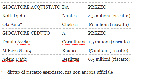 CESSIONI - Movimenti anche in uscita, con i riscatti di Ljajic, Avelar e Niang; che hanno portato circa 23 milioni nelle casse del Torino. Il più ricco è senza dubbio quello dell'attaccante senegalese, acquistato a titolo definitivo dal Rennes per 15 milioni di euro al termine di una stagione molto positiva. Discorsi simili anche per Ljajic e Avelar, riscattati da Besiktas e Corinthians rispettivamente per 6,5 e 1,5 milioni di euro. Ci saranno altre cessioni? Probabilmente sì, ma Cairo è stato chiaro: "Terremo i migliori".