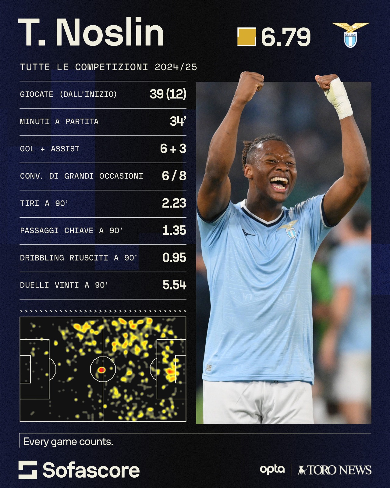—Non torniamo indietro fino ai tempi del Verona... o meglio, non solo. Baroni ha avuto modo di sperimentare il talento dell'olandese sia a Verona, in minima parte, ma poi ancora più a lungo sulla panchina della Lazio. Con il 4-2-3-1 nella capitale l'attuale tecnico granata ha mostrato un buon calcio, dando grande risalto al gioco sugli esterni. Con queste condizioni ha avuto modo di mettersi in mostra Tijjani Noslin. Nella stagione 2024/2025, come riporta la grafica fornita da Sofascore, l'olandese si è proposto non come titolare nella maggior parte delle occasioni ma come un elemento fondamentale in ogni uscita. 39 presenze significano tanto, e nonostante i 34' minuti in media a partita, Noslin è comunque riuscito ad arrivare quasi in doppia cifra tra gol e assist, con un buon dato sulla conversione di grandi occasioni. 2,23 tiri e 1,35 passaggi chiave a partita sono i dati di un giocatore che, in varie zone del campo (come evidenzia la sua heatmap), è riuscito ad entrare nel vivo del gioco e mostrarsi utile anche per i propri compagni. Questa è la grande differenza con Ngonge: è vero che Noslin nasce come esterno destro, ma in realtà in Serie A ha giocato prevalentemente come punta centrale (o seconda punta, che dir si voglia): 29 partite su 49 giocate nelle zone centrali dell'attacco. Forse l'aspetto più importante, visto come ha reso Ngonge in granata.
