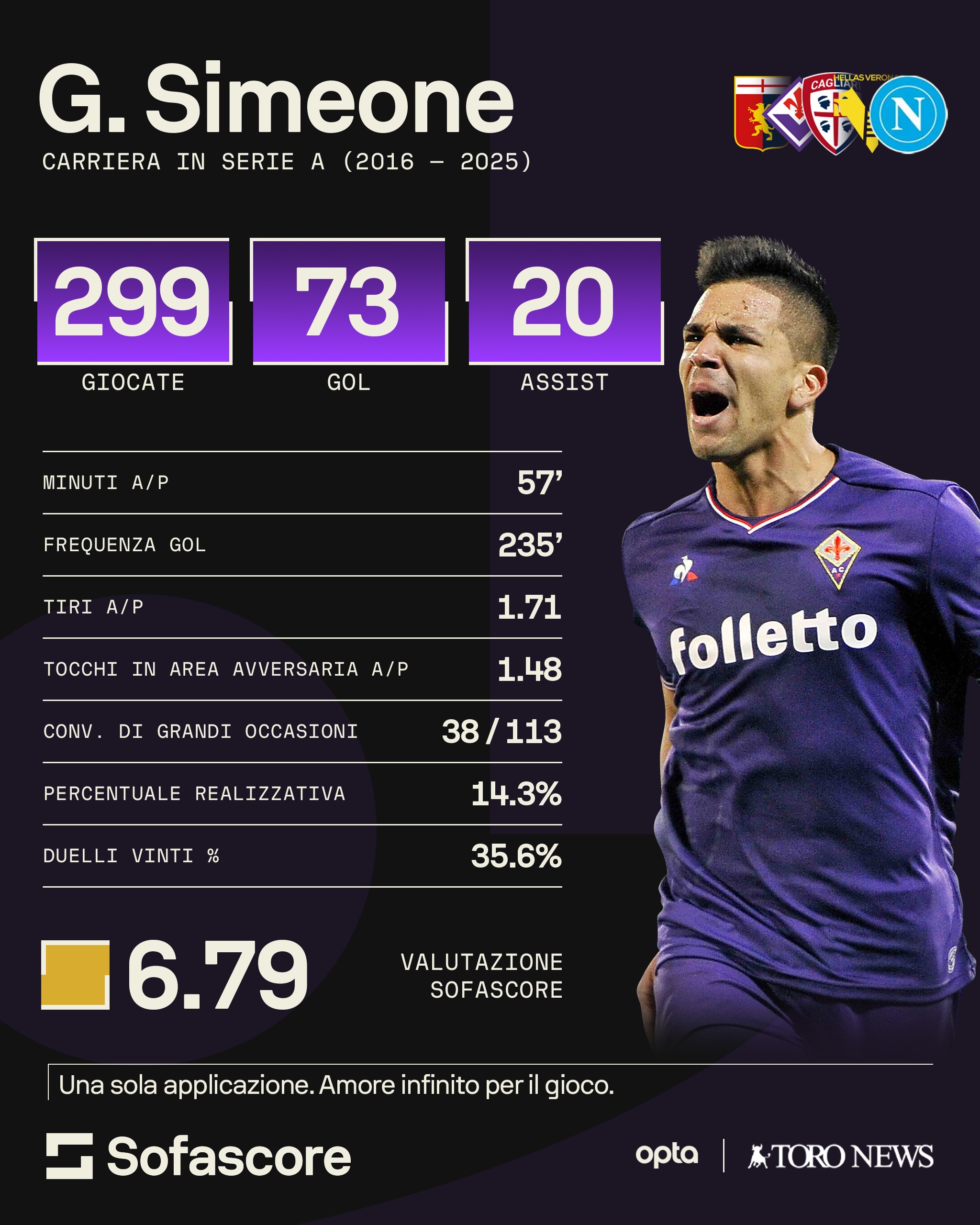 Il nome di Simeone da anni viene periodicamente accostato al Torino. L'attaccante argentino da tempo gioca con continuità in Serie A dove ha già indossato cinque maglie: Genoa, Fiorentina, Cagliari, Verona e infine attualmente quella del Napoli. Da quando il figlio d'arte è approdato nel massimo campionato italiano nel 2016 è sceso in campo 299 volte, mettendo a referto 73 gol e 20 assist. I dati mostrano come Simeone abbia una percentuale di un gol ogni 235' minuti nelle nove stagioni in Italia. Con l'ultimo anno al Napoli che non è stato particolarmente produttivo, il classe '95 ha visto calare le proprie statistiche: Simeone ha giocato in media 57' minuti a partita, possiede una percentuale di 1.71 tiri e 1.48 tocchi in area avversaria a match con una percentuale realizzativa del 14.3%. Per l'argentino in totale a Napoli sono 103 le presenze, 14 i gol e 4 gli assist come attaccante di riserva, di Osimhen prima e Lukaku poi. In particolare, nell'ultima opaca stagione sotto la guida di Antonio Conte, il centravanti ha messo a referto soltanto 2 gol e 2 assist. Ora, dopo aver anche compiuto 30 anni il mese scorso, Simeone cerca un nuovo progetto per rilanciarsi.