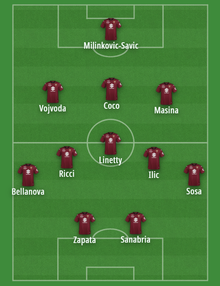 Vanoli ha iniziato a impostare la squadra con il 3-5-2. In attesa del recupero di Schuurs, è Coco a giocare come centrale difensivo, con Vojvoda braccetto di destra e Masina sul lato opposto. A centrocampo grande ressa per tre maglie: quando rientrerà a disposizione, Vlasic contenderà una maglia da titolare a Ricci. Ilic non è incedibile, ma in caso di permanenza sarebbe lui il titolare sul centrosinistra. Bellanova intoccabile sulla destra, a sinistra il titolare sarà il nuovo arrivato Borna Sosa. Capitolo attacco: Zapata è il punto fermo, Adams e Sanabria (anche lui non intoccabile sul mercato) si contendono una maglia al fianco del colombiano.