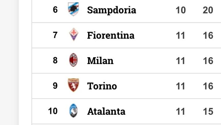 Classifica ancora molto corta quella della Serie A, dopo l'undicesima giornata. Il Torino, con la vittoria di questa sera contro il Cagliari, ha agganciato il settimo posto. Posizione che potrebbe essere valida per l'Europa League, dipende da chi uscirà vincitrice della Coppa Italia. I granata si sono portati alla pari di Milan e Fiorentina che entrambe sono state sconfitte. I primi contro la Juventus nel posticipo di sabato, la viola nel pomeriggio domenicale contro il Crotone.
