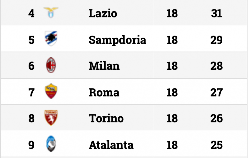Risultati sorprendenti in questa 18esima giornata, giocata, inusualmente, nel giorno di Santo Stefano. Succede di tutto in zona Europa League. L'Atalanta riesce a strappare un pareggio in casa contro la Juventus. Perde lo scontro diretto la Fiorentina contro il Parma. Pareggia, a sorpresa, il Milan contro il Frosinone nel lunch-match. E' vera bagarre in zona Europa tra il quarto e il dodicesimo posto ci sono nove squadre in un fazzoletto di sei punti.