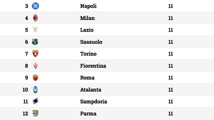 "Il Torino vince contro la Sampdoria ed entra nella zona Europa League. I granata scavalcano anche Roma e Fiorentina che, nell'anticipo si sono annullate con un pareggio, e si piazzano al settimo posto in solitaria, alle spalle del Sassuolo che oggi ha vinto contro il Chievo Verona di Ventura. Belotti e compagni distano quattro punti dalla zona Champions occupata dal Milan che, nel posticipo, ha ottenuto una vittoria all'ultimo respiro contro l'Udinese. I rossoneri sono a pari punti con la Lazio che ha vinto contro la SPAL. Nelle prime tre posizioni troviamo Napoli e Inter a quota 25 punti, entrambe hanno vinto, rispettivamente, contro Empoli e Genoa. La Juventus è al primo posto a quota 31 punti dopo la vittoria contro il Cagliari.