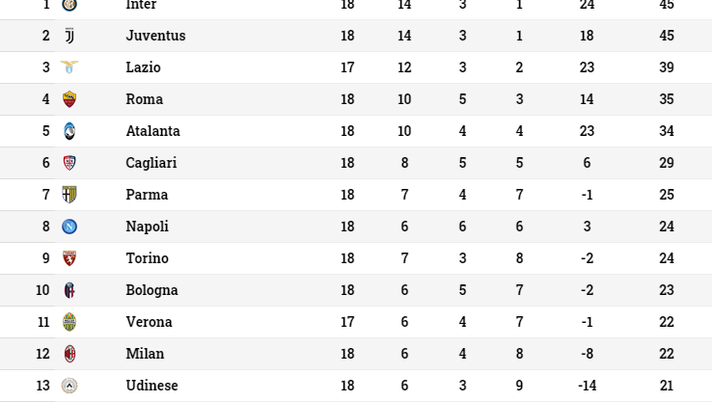 Serie A, la classifica: perdono Parma, Napoli e Cagliari. Torino a -5 dal 6° posto