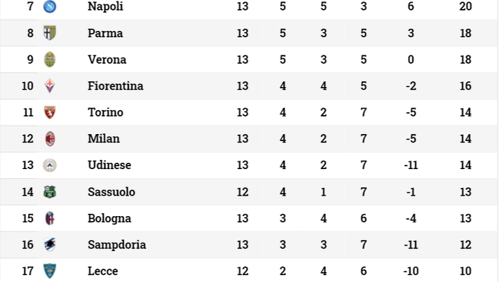 Sta per concludersi la tredicesima giornata di Serie A: mancano infatti solo Lecce-Cagliari (prevista per oggi alle ore 20:45 ma rinviata, causa maltempo, a domani alle 15) e la sfida ai piani bassi della classifica tra Spal e Genoa (prossimo avversario dei granata in campionato). Dopo le gare di oggi il Torino rimane all'undicesimo posto, appaiato a Milan ed Udinese a quota 14 punti: i granata non sono stati infatti superati né dal Bologna (che ha pareggiato 2-2 contro il Parma) né dal Sassuolo (perdente per 2-1 contro la Lazio), che quindi concludono la loro tredicesima giornata a quota 13 punti. Le altre gare di oggi hanno visto la Roma vincere 3-0 contro il Brescia, l'Hellas Verona battere la Fiorentina 1-0 e la Sampdoria vincere 2-1 sull'Udinese.