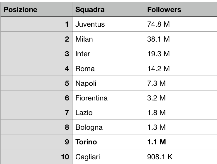 Stiamo vivendo nell'era dei social e questo non è un mistero, per questo anche le aziende stanno investendo sui loro profili, da Facebook ad Instagram. Il mondo del calcio non è ovviamente da meno, ed i club italiani stanno puntando molto sulla loro immagine social. Prima di andare ad analizzare la situazione del Torino nello specifico, è bene dare un'occhiata alla situazione in generale della Serie A. A dominare sui social è la Juventus con i suoi quasi 75 milioni di follower tra le varie piattaforme e subito dietro ci sono le due milanesi: Milan (38,1 milioni) ed Inter (19,3 milioni). Inutile specificare come il blasone internazionale di queste 3 squadre le porti a ottenere un seguito del genere (il Torino al momento ne ha in totale 1,1 milioni). Il caso più interessante è quello dei bianconeri, che, prima dell'arrivo di Cristiano Ronaldo, avevano 49 milioni di seguaci tra i vari social e un anno dopo hanno incrementato di quasi 30 milioni di persone il loro seguito. Quarta di questa speciale classifica è la Roma con 14 milioni di follower. Non è un caso che la top 4 tocchi a queste società, perché tutte hanno investito sui social media. Ma perché questo aspetto sta diventando così importante? Le motivazioni vanno da questioni legate al marketing ad altre legate alla fidelizzazione degli utenti.