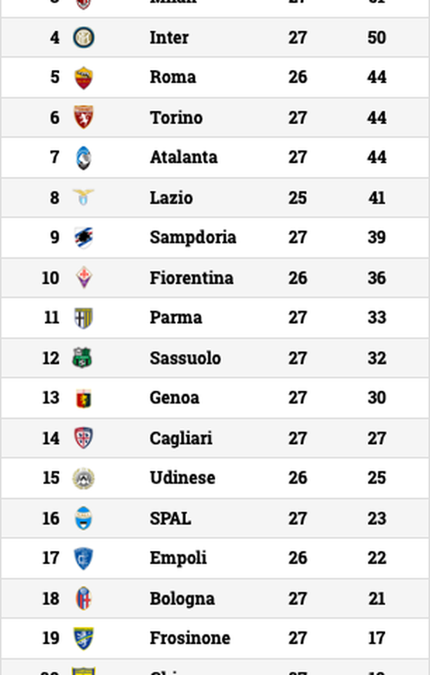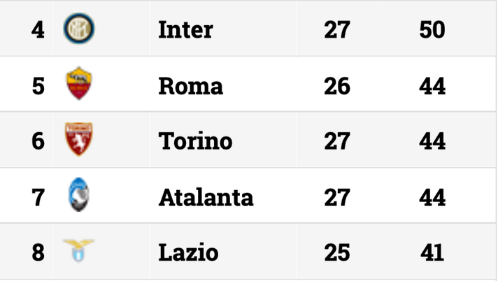 "BAGARRE EUROPA - Milan e Inter sono al terzo e quarto posto a quota 51 e 50 punti, sotto di sei punti ci sono a pari punti Roma, Torino e Atalanta. In attesa dei due posticipi di Lazio e Roma, in zona Europa è bagarre.