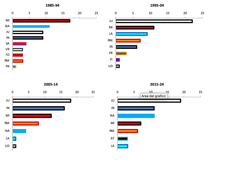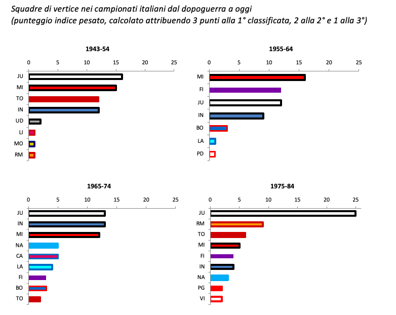 Anche in questo caso, guardando i dati sui campionati dal dopoguerra a oggi, l’impressione è che ci troviamo di nuovo in uno di quegli ambiti in cui la memoria rischia in parte di giocare brutti scherzi; in questo caso, rievocando ad esempio gli scudetti “anomali” di Cagliari, Toro, Verona, Sampdoria, oppure le gloriose avventure del Vicenza o del Perugia in lotta per il titolo in un qualche ormai remoto campionato degli anni 70. Se prendiamo in considerazione i campionati dalla seconda guerra mondiale in qua, e consideriamo le prime 3 posizioni (ossia le squadre che, bene o male, hanno almeno intravisto la possibilità di lottare per lo scudetto) emerge come il numero di squadre piazzatesi almeno una volta in queste posizioni sia cambiato relativamente poco nei decenni: 7-8 fino agli anni 60, poi 9 nei successivi trent’anni, per poi ritornare a 7 squadre negli ultimi due decenni.