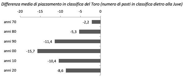 Considerando solo gli ultimi 50 anni circa, è abbastanza evidente (oltre che noto) come tra Toro e Juve le distanze siano rimaste relativamente ridotte dagli anni 70 ai primissimi anni 90, con un lieve svantaggio granata medio nei piazzamenti rispetto ai bianconeri (e addirittura con 3 anni in controtendenza – 1976, 1984 e 1992 – col Toro a fine campionato davanti alla Juve). Poi però le distanze si sono progressivamente ampliate, fino a ingigantirsi e toccare i livelli peggiori nel decennio attorno al 2000, per ridursi di nuovo in anni recenti (mantenendo tuttavia distacchi medi dalla Juve decisamente più consistenti di quelli degli anni 70 e 80.
