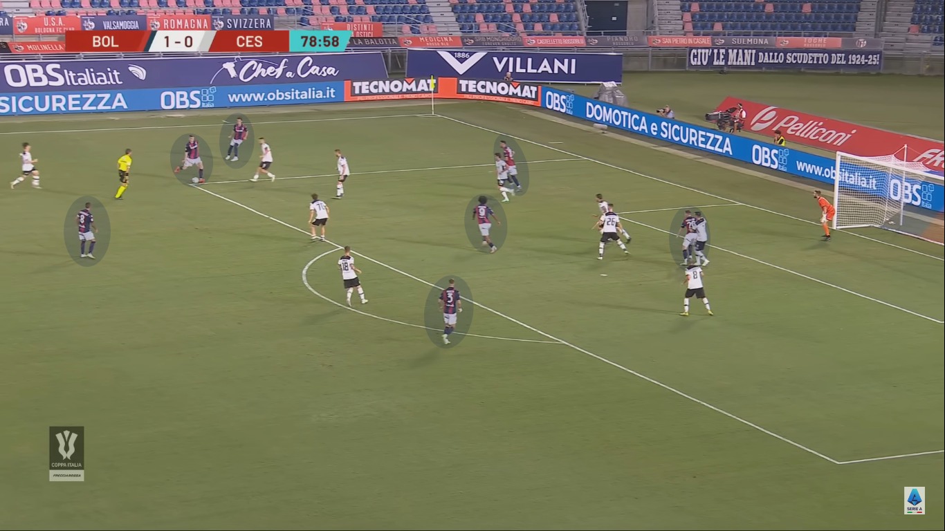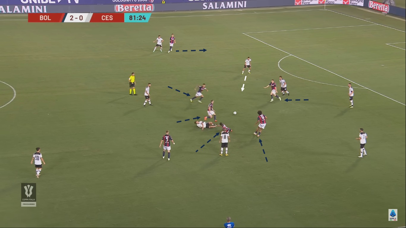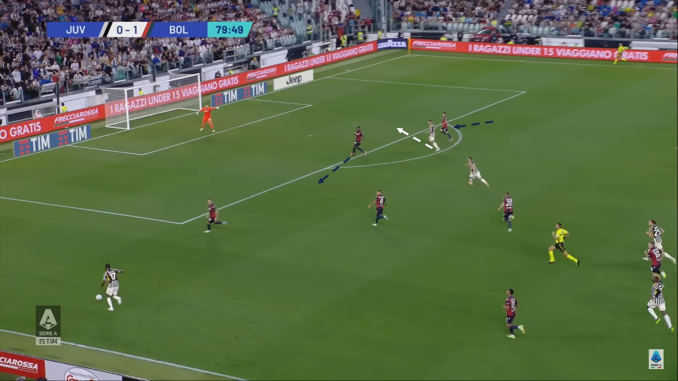 Oltretutto, i felsinei possono trovarsi in difficoltà anche nelle marcature all'interno dell'area di rigore. Nel gol subito contro la Juventus, Lucumí lascia troppo spazio a Vlahovic, e Corazza non è riuscito ad assorbire il suo perfetto inserimento.