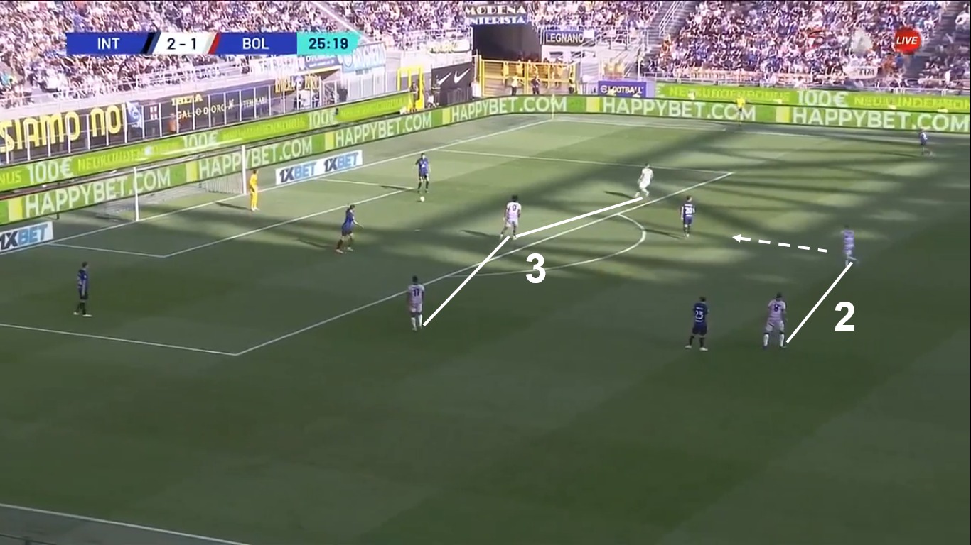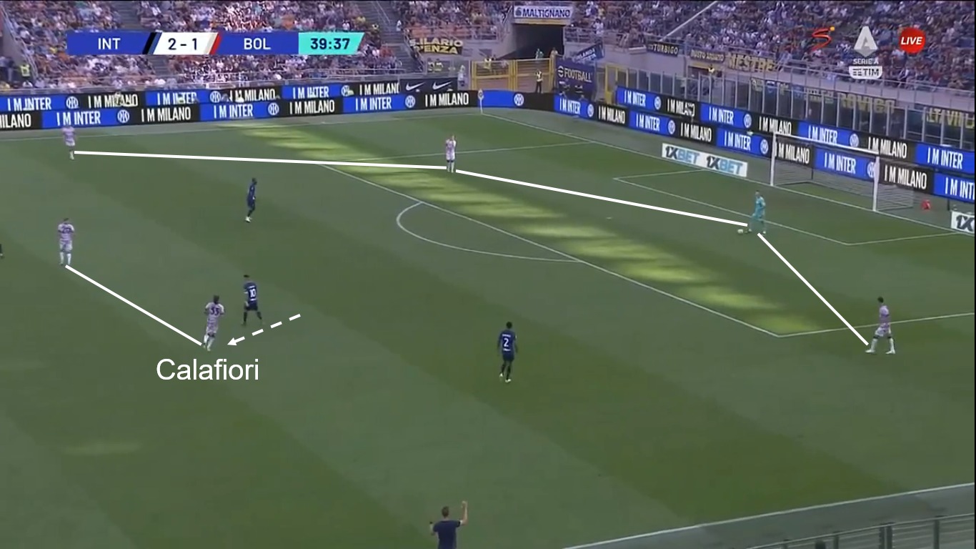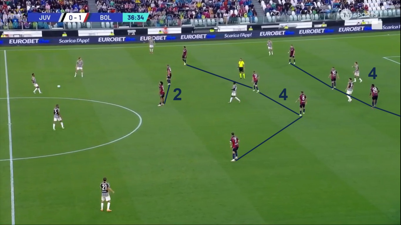 Oltretutto, i felsinei possono trovarsi in difficoltà anche nelle marcature all'interno dell'area di rigore. Nel gol subito contro la Juventus, Lucumí lascia troppo spazio a Vlahovic, e Corazza non è riuscito ad assorbire il suo perfetto inserimento.